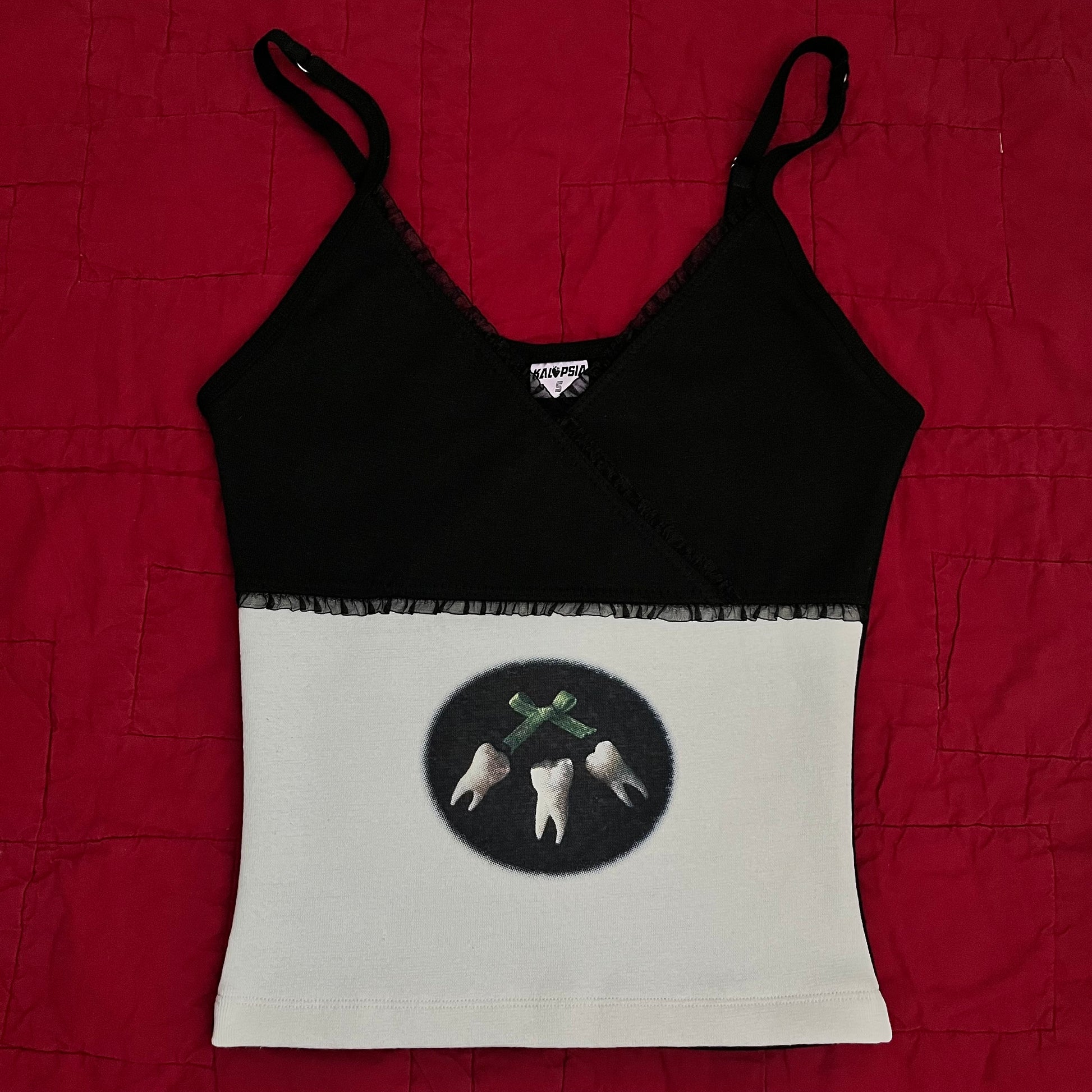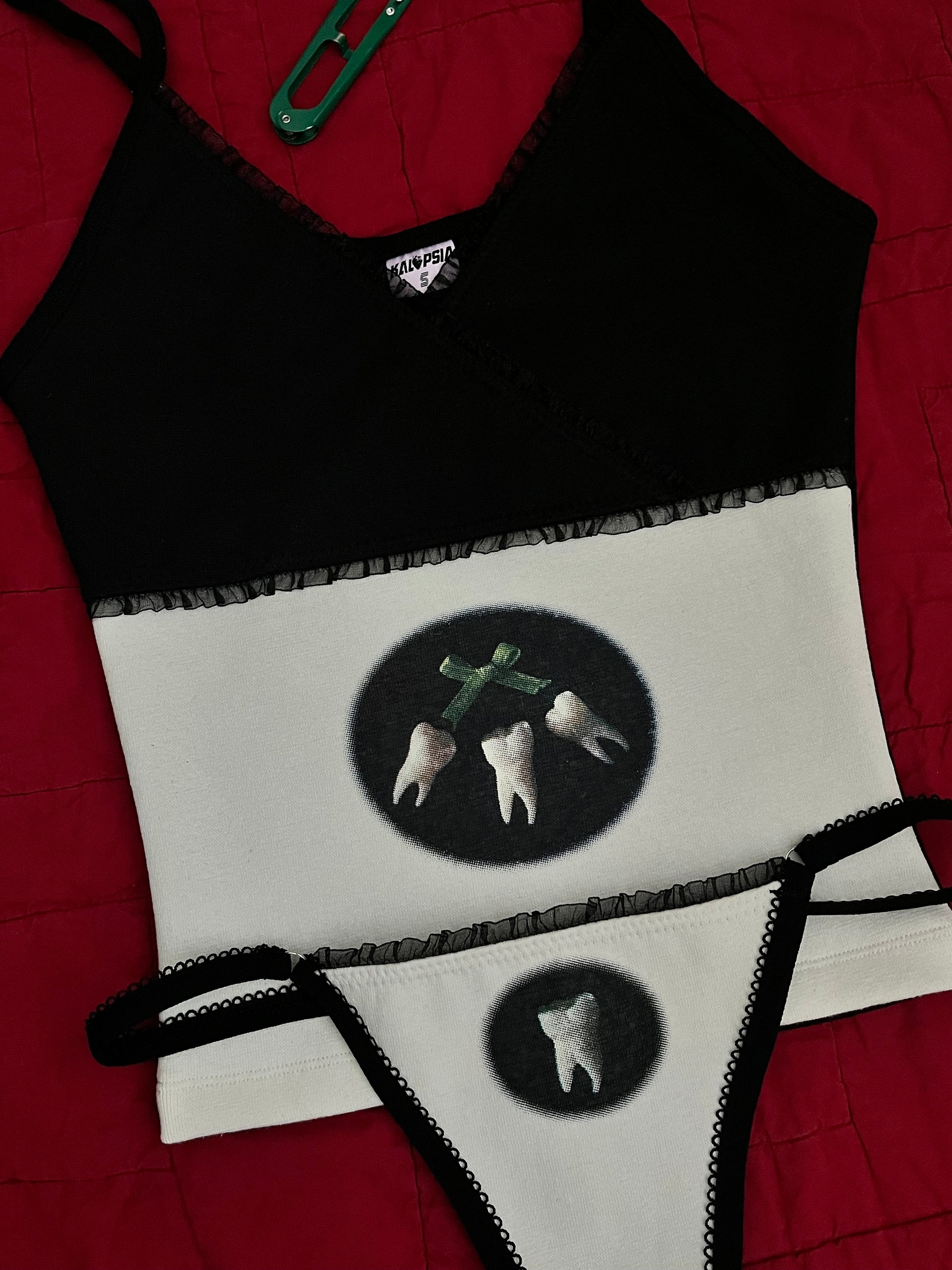 The matching cami to our T00TH thong. Handmade with biodegradable hemp fabric and screen printed with water based inks. Each piece is hand sewn and printed so print may be darker/lighter than pictured. Model is wearing an XS (cropped). Pre made items ship in 1-2 business days.